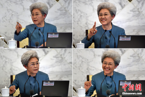 3月4日,大会发言人傅莹就大会议程和人大工作相关问题回答中外记者的提问。(拼版图片) 中新社记者 金硕 摄