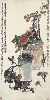 虽说如此,少数应人之请而写绘的作品,吴氏仍不可免俗地将牡丹置入画中,如2007年4月9日香港苏富比“中国书画”拍场编号982吴昌硕《岁朝清供图》,此件作于1923年,画中梅枝三两,居高列后,盆植牡丹与瓶栽蒲草,前后有序。灵芝与荔枝分散在前景,整画紧凑丰满,布局层次分明,笔法隽逸洒脱,色彩清丽多姿,一片生机盎然,体现了吴氏运笔遒劲古拙的独特风韵。