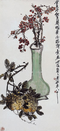 此幅作于是年冬天,画中直颈绿瓶里随意插着几枝怒放红梅,梅枝劲挺有力,梅花傲然盛开,繁而不乱,错落有致,三两细枝探向左下,顺势带出一枝两枚硕大的香橼,与瓶梅前后、高低呼应。橼字音“圆”,带有团圆、圆满寓意。全件铺陈有序,繁简得宜,古朴间流露生意,别有逸趣。此件最终以高出预估价的人民币64.96万元拍出。