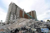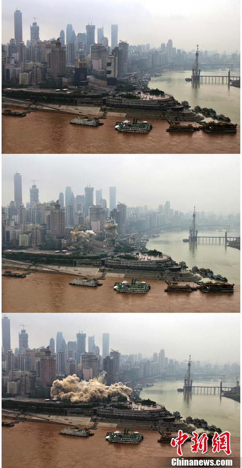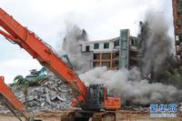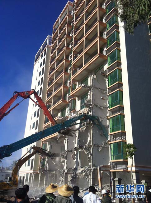 2012年9月12日,海南三亚市综合行政执法局强制拆除一栋高13层、建有460套房、总建筑面积达22000平方米并建有观光电梯的大型违建。据了解,连同去年拆除的一栋相同规模违建,这两栋总投资过亿、被称作三亚“最牛”违建终被彻底拆除。 记者现场看到,该违建的水泥石块中根本未浇筑钢筋,而是被一根根铁条代替。用手轻轻一掰,铁条就很轻易地变弯了。图为拆除现场。图片来源:新华网