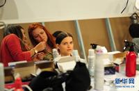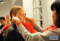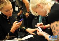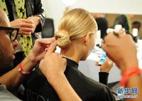 当地时间2012年9月13日,在纽约时装周的拉夫·劳伦秀场后台,造型师为一名模特进行面部按摩。当日,时装品牌拉夫·劳伦在2013纽约春季时装周上发布新品。本次时装周亦在当天落下帷幕。邓坚 摄 图片来源:新华网