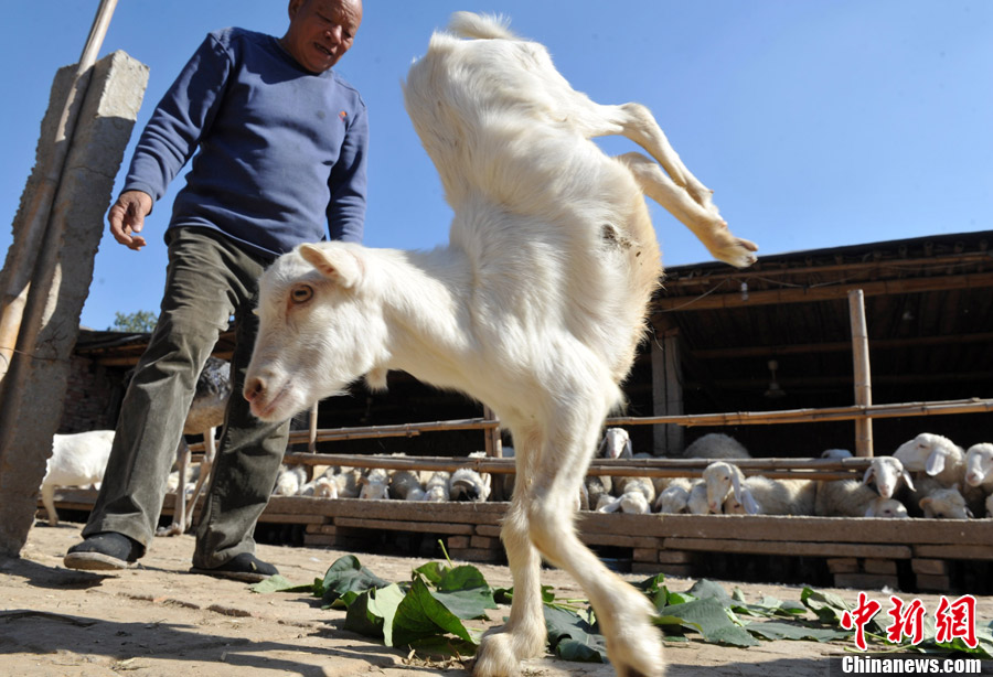 10月11日,在河北石家庄晋州市北寺村村民陈福海家羊圈里,一只倒立行走的神奇小羊正与伙伴们一同进食。据陈福海介绍,这只小羊8个月大,出生时两条后腿蜷缩着,有个三几天就会走了,但与众不同地是,它只用两条腿走路。这只小羊刚开始用两条腿走路的时候老栽倒,但栽倒后继续站起来接着走,越走越硬朗。陈福海说,除了走路方式不同外,这只羊跟其他羊没什么两样。他养羊已经有30多年了,从没有碰到过这样的情况。当地畜牧站的工作人员也曾经到他家看过,但也没有给出合理的解释。中新社发 翟羽佳 摄