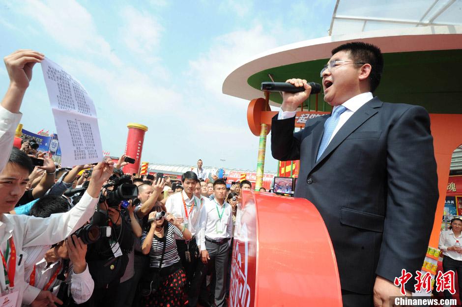 10月18日,第87届全国糖酒商品交易会在福州开幕。陈光标出现在福州全国糖酒会其“好人系列”产品展台前,高调亮相,为其好人系列产品进行宣传并宣布启动中国食品行业好人联盟。陈光标称,此次他做“好人凉茶”和“好人暖茶”的主要目的不是卖茶,而是希望能通过饮料这个载体,唤起更多人“长好心,做好事,做好人”,达到宣传环保,宣传慈善的目的。图为陈光标为现场媒体及观众动情演唱歌曲《我爱你中国》。中新社发 刘可耕 摄