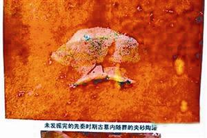 考古所展示的未挖掘完古墓内随葬的夹砂陶罐图片。