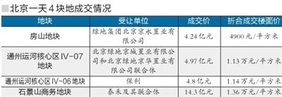 其中,拿下上海地王的绿地集团北京京永置业有限公司以4.24亿元竞得房山地块。同时,北京绿地京城置业有限公司和北京绿地京华置业有限公司联合体还斩获了通州运河核心区的IV-07地块。