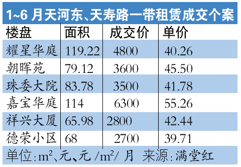 另据满堂红统计数据显示,今年1月~6月份天河东、天寿路两路段的平均租金为46.55元/m2/月,同比去年同期租金均价下跌了16.8%。而今年1~6月份的成交量也有明显减少,减幅约46%。