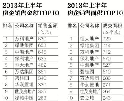 2013年上半年,全国房企销售额前十名的市场总份额为15.21%,同比基本持平,与去年全年相比,微增2.45%;同时,TOP10房企入榜门槛达到283亿元,与去年上半年174亿元的门槛相比,增幅达63%。而以销售面积计,今年上半年,TOP10房企入榜门槛达到243万平米,较去年的183万平米增加了60万平米。