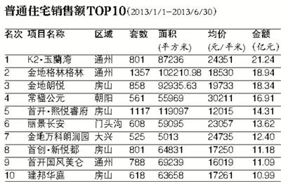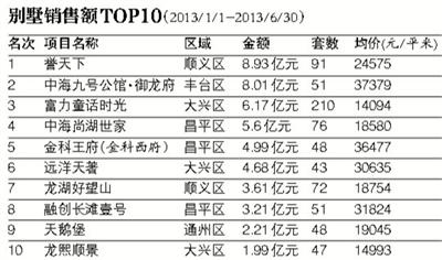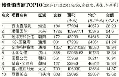根据亚豪、易居等机构数据统计显示,截至2013年6月30日,北京住宅单盘(含住宅、商住、车库、写字楼等)销售额前10名销售总额为174.69亿元,同比2012年上半年多增76.33亿。