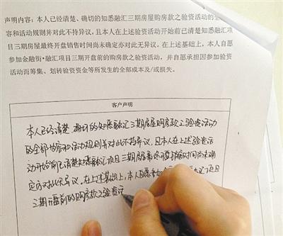 位于天宫院板块的金融街·融汇项目,要求购房人进行现场验资,并签署一份验资协议,其中还要求购房人亲手抄写“验资声明”。新京报记者 大路 摄