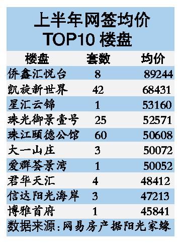 本报讯 (记者王荔珏)2013年上半年,单价最高的楼盘是珠江新城的侨鑫汇悦台,尽管只成交了8套,单价却高达8.92万元/m2,较去年同期的最贵盘博雅首府的6.5万元/m2涨了2.42万元/m2。位居第二的是珠江新城的指标性豪宅凯旋新世界,均价为6.84万元/m2,较去年同期也涨了近万元。