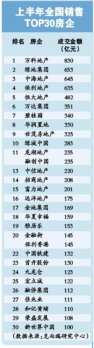 统计显示,除了万科以外,绿地集团的业绩也相当不俗,以653亿元销售额位居第二,中海地产以645亿元位居第三。从成长性来看,碧桂园的增长幅度最高,出现近100%的同比销售额增幅。分析指出,除了大环境的改善之外,也得益于其营销模式上的突破。绿地上半年销售额653亿元,同比增长45%,其多元化的产品线、合理的城市布局以及借力资本市场的行动都将继续助推企业的规模和地位更快地提升。此外,华夏幸福也成为跻身房企前20强的唯一地方级房企。