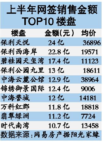 本报讯 (记者王荔珏)2013年上半年全市网签销售金额第一的是保利天悦,该盘销售总金额达24亿元,较去年同期的雅居乐剑桥郡的17.6亿元的成交额增长了36%。