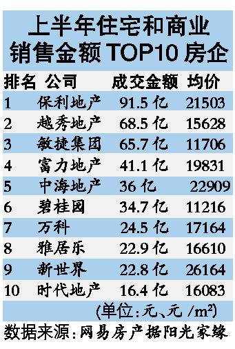 本报讯 (记者王荔珏)据网易的统计显示,今年上半年,保利在广州地区的销售额达到91.5亿元,与去年同期的100亿元水平相接近。排名第二的是越秀地产,成交金额为68.57亿元。敏捷地产位居第三,取得了65.75亿元的销售业绩,几乎可与越秀地产“拗手瓜”。