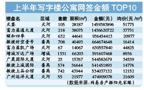 出现这样的市场行情,主要是因为去年上半年的写字楼、商业公寓市场中,地处天河、海珠等市中心的优质写字楼物业成交占绝对主力,虽然总成交套数比今年同期要少很多,但胜在单价贵,其成交金额亦水涨船高。反观今年上半年的写字楼和商业公寓市场,全市网签成交套数TOP10楼盘中,增城、番禺、萝岗、花都等外围板块的项目占了大半壁江山。