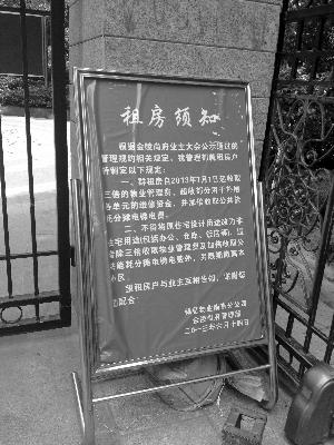 昨天上午,现代快报记者来到金陵尚府小区,小区大门口张贴着一张醒目的“租房须知”。通知称,根据小区业主大会公示通过的管理规约,小区物业公司发布两条规定:一、群租房自2013年7月1日起,收取3倍的物业管理费,超收部分用于补偿各单元的维修资金,并加倍收取公共能耗分摊电梯电费。二、不得将原住宅设计用途改为非住宅用途(包括办公、仓库、饭店等),违者除3倍收取物业管理费及加倍收取公共能耗分摊电梯电费外,另限期撤离小区。落款是银亿物业南京分公司金陵尚府管理部。