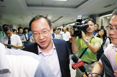 昨日,拍得农展馆地块的融创代表在北京市土地整理储备中心拍卖大厅被媒体围住。竞拍时,经过61轮竞争,融创以配建27.8万平方米医院的条件胜出。新京报记者 李飞 摄