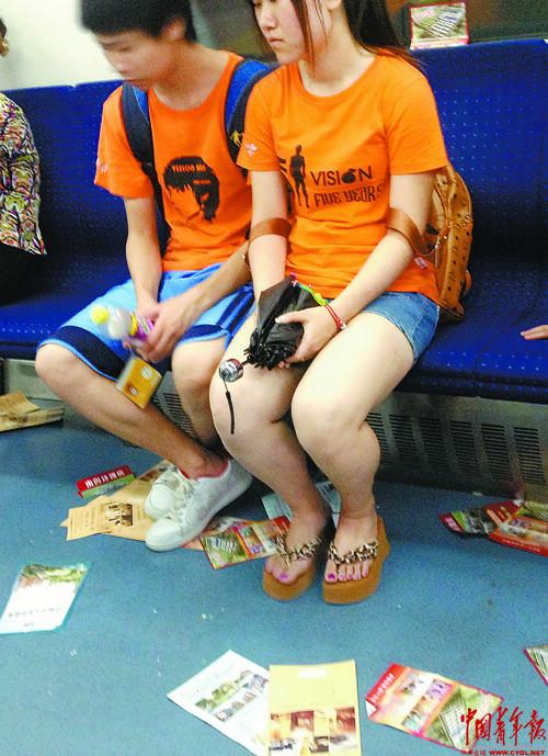 8月19日,北京地铁二号线上,一对年轻情侣望着脚下的售房传单。杨杰摄