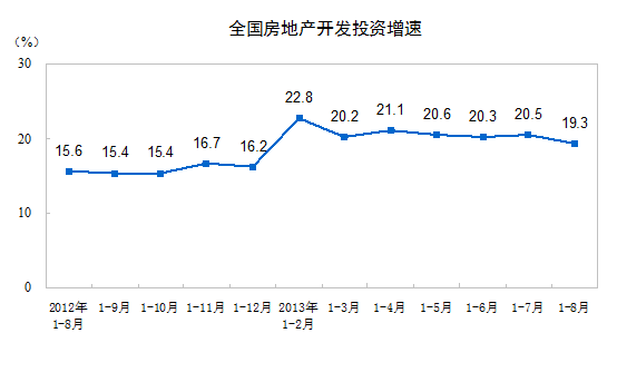 2013年1-8月份,全国房地产开发投资52120亿元,同比名义增长19.3%,增速比1-7月份回落1.2个百分点。其中,住宅投资35738亿元,增长19.2%,增速回落1个百分点,占房地产开发投资的比重为68.6%。