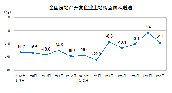 1-8月份,房地产开发企业土地购置面积21482万平方米,同比下降9.1%,降幅比1-7月份扩大7.7个百分点;土地成交价款5050亿元,增长5.2%,增速回落9.5个百分点。