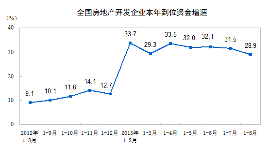 1-8月份,房地产开发企业到位资金76960亿元,同比增长28.9%,增速比1-7月份回落2.6个百分点。其中,国内贷款12883亿元,增长30.3%;利用外资344亿元,增长17.2%;自筹资金29216亿元,增长16.7%;其他资金34517亿元,增长40.9%。在其他资金中,定金及预收款21162亿元,增长38.1%;个人按揭贷款9102亿元,增长50.3%。