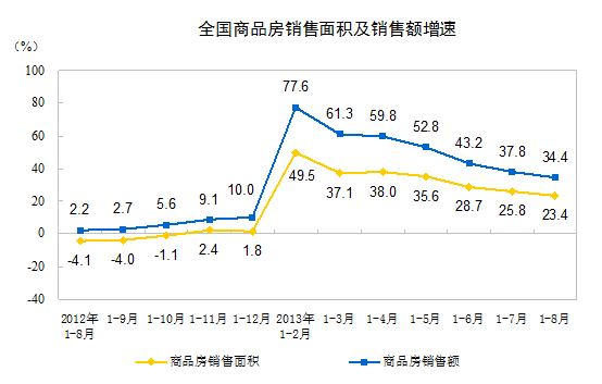 中新网9月10日电 据国家统计局网站消息,2013年1-8月份,全国房地产开发投资52120亿元,同比名义增长19.3%,增速比1-7月份回落1.2个百分点。1-8月份,商品房销售面积70842万平方米,同比增长23.4%,增速比1-7月份回落2.4个百分点;商品房销售额45724亿元,增长34.4%,增速比1-7月份回落3.4个百分点。