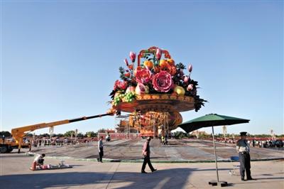 昨日,天安门广场,国庆花坛的主景观“花果篮”已吊装到位,工作人员正在做最后的补漆。新京报记者 薛珺 摄