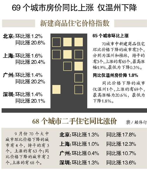 昨日,国家统计局公布了9月全国70个大中城市房价数据,结果显示:65个城市新建商品住宅价格环比上涨,数量较8月有所减少,且涨幅有所回落。但同比去年,房价上涨的城市仍多达69个,涨幅继续扩大,北京涨幅最高20.6%,上海、广州、深圳涨幅也都超过了20%,广州的同比涨幅更创下年内新高。而在70个城市中,仅温州房价同比出现下跌。