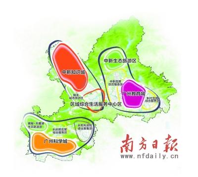 其中,西部组团以科学城为内核,总面积为172平方公里,规划建设用地面积74.3平方公里;中部组团以知识城为内核,总面积为179平方公里,规划建设用地51.4平方公里;东部组团以教育城为内核,总面积为332平方公里,规划建设用地49.5平方公里。