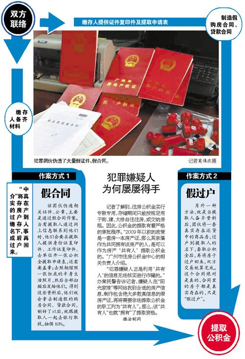 警方分析发现,这一长期活动在广州的广东兴宁籍“中介”团伙在网上发出办理“公积金提取”、“公积金套现”等业务的信息链接,与有需求的“职工”取得联系后,由“中介”携带伪造的证明文件,到银行网点为“职工”套取公积金。