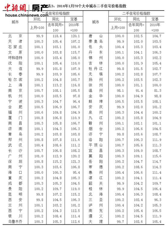 中新网2月24日电 国家统计局24日发布的70个大中城市住宅销售价格月度报告显示,2014年1月,70个大中城市中,新房价格环比下降的城市有6个,持平的城市有2个,上涨的城市有62个;二手房方面,价格环比下降的城市有13个,持平的城市有9个,上涨的城市有48个。