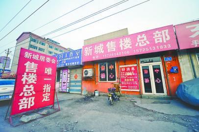 在新城社区内已建成的一栋22层高的楼房前面,一个小卖铺的门口写着售楼处的字样,但是没有留电话。在热心市民的指引下,记者在新城社区西边的新赵路上,发现两个地方都写有新城社区售楼处的招牌。在新赵路路东的一个门头上写着“新城社区售楼处”,并且留了两个电话。在新赵路路西的一个位置,一个门头上写有很醒目的“新城社区售楼处”,并且注明了居委会指定字样。