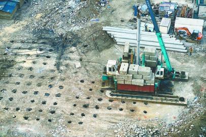 记者正在观察时,突然被一声刺耳的声音吓了一跳——— 打桩机的吊臂转弯,发出“吱吱”的响声,在晚上显得格外刺耳。随后记者爬上工地前面的一幢高楼,从20层往下看,发现正在施工的打桩机旁边有不少已经打下去的水泥柱子。
