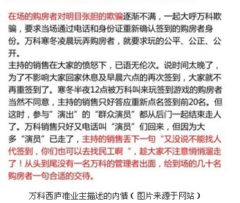 而对于万科西庐“火爆热销”的内情,有准业主网友在某知名购房网站的论坛上道出了他被迫参与其中,“帮助”制造热销的内情(见图片)