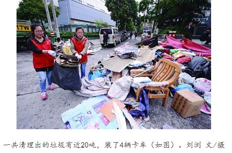 记者跟随街道工作人员来到高云岭,对一户居民收藏并堆放在公共空间的垃圾进行清理。据了解,这位90岁的老人因长期收藏垃圾,周边居民意见很大,投诉该住户的“12345”工单就达几十个。不过这位老人收藏垃圾并不是为了卖钱,她们一家人有四五套房产,但她勤俭节约惯了,养成了收集垃圾的习惯。社区不断上门做老人和儿女的工作,终于在昨天将部分垃圾清理出去。一共清理出的垃圾有近20吨,装了4辆卡车(如图)。刘浏 文/摄