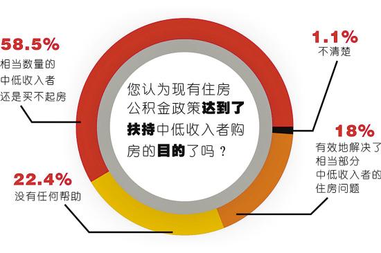 “您认为现有住房公积金政策达到了扶持中低收入者购房目的了吗?”调查显示,58.5%的人称“效果不明显,差强人意”,18.0%的人认为“有效地解决了相当部分的中低收入者的住房问题”。
