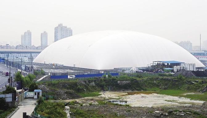 一座相当于3个标准足球场大小的白色充气大棚近日现身杭州。占地两万平方米、高36米的大棚下的地块从2009年开始闲置,原是杭州市农药厂,土壤因工业污染散发出刺激性气味。2012年9月,地块现业主单位杭州市工业资产经营投资集团曾着手进行污染土壤修复工作,后因气味过大,影响周围居民生活,修复工作一度停工。图为巨型充气大棚。