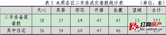 二手房方面,长沙二手房市场“惨淡”开局。数据显示,上周长沙内六区二手房成交253套,环比下跌31.3%,面积2.63万平方米,其中住宅成交237套,环比下跌28.6%,面积2.55万平方米。从区域来看,长沙二手房市场依然是中心城区市场较为活跃,雨花区69套、开福区47套、岳麓区47套分列各区前三。