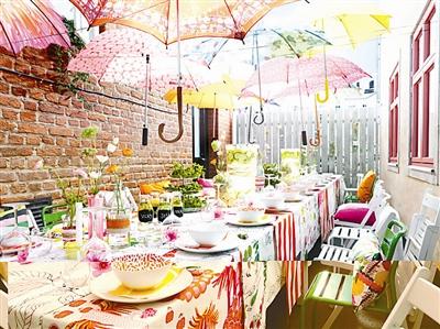 方便折叠的户外餐桌,构造简约的纯色坐椅,配上花色跳跃明快的桌布,放上晶莹透亮的杯罐碟碗,与亲朋好友在明亮多样的遮阳伞下享受夏日的热情。