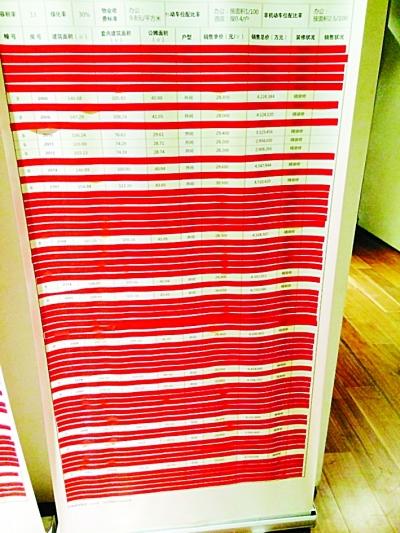 这家楼盘位于河西CBD,记者在售楼处现场了解到,该项目目前在售B幢楼40年产权的精装酒店式公寓,共有300多套。从现场公示的销售进度表来看,3/4的房源都被贴上了红条,售楼员告诉记者,贴上红条的房源就表示已经卖掉,只有没贴条的房源才可以购买。