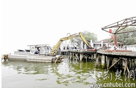 昨日,执法部门拆除两家餐馆共2000多平米的违法建设,为武汉市拆除水上违建规模最大的一次。