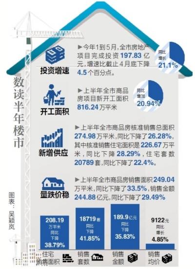 上半年全市商品房项目新开工面积816.24万平米,同比增加了20.94%,竣工面积422.99万平方米。