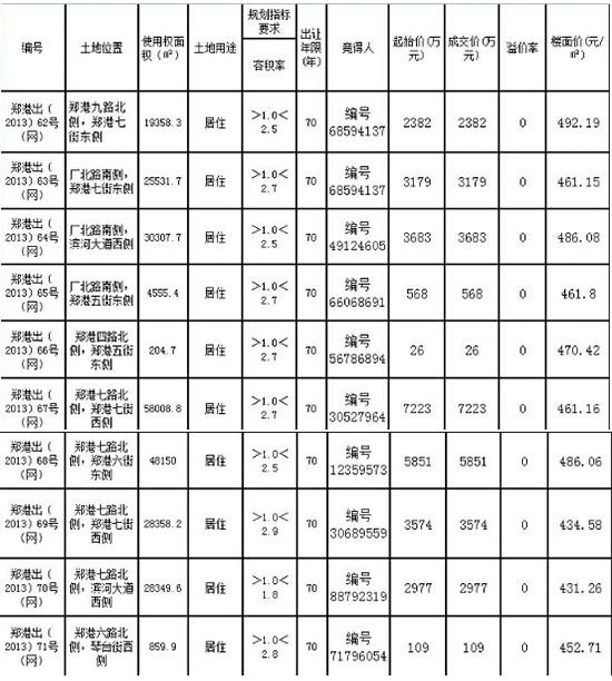 7月10日,郑州国土资源局网上挂牌出让航空港区10宗地块,历时四个半小时左右,10块土地成功出让,且10宗地块均为港区合村并城安置区建设项目用地。此外,7月10日下午,郑东新区如意西路东附近的两块商服用地挂牌出让,现场仅1家房企参与竞争,最终河南黄河明珠置业有限责任公司3.2亿底价摘得两块地,总面积达37.9亩。其中,4号地位于丰盈路北,如意西路东,面积约20亩,容积率小于3.5,绿地率大于10,土地用途为商务金融用地,土地出让年限为40年,成交价为18280万,楼面价为3806元;5号地位于朝阳路西,如意西路东,面积约17亩,容积率小于3.0,绿地率大于10,土地用途为住宿餐饮,土地出让年限为40年,成交价为13720万,楼面价为3959元.