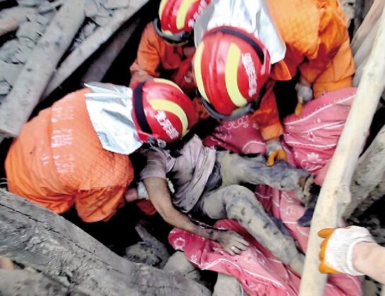 4 时10分,随着村民不停地呼喊,一声微弱的救命声从左侧废墟下面传出,救援人员循着声源,很快找到了被困者准确位置。为了防止第二次垮塌,村民迅速找来木桩将残墙撑住固定,众人用手搬开横梁、砖块……20多分钟后,老人的外孙从废墟里抬了出来(如图)。5时20分,压在废墟下的老人被发现,老人全身被砖瓦掩埋,动弹不得,呼吸困难,救援人员迅速施救。