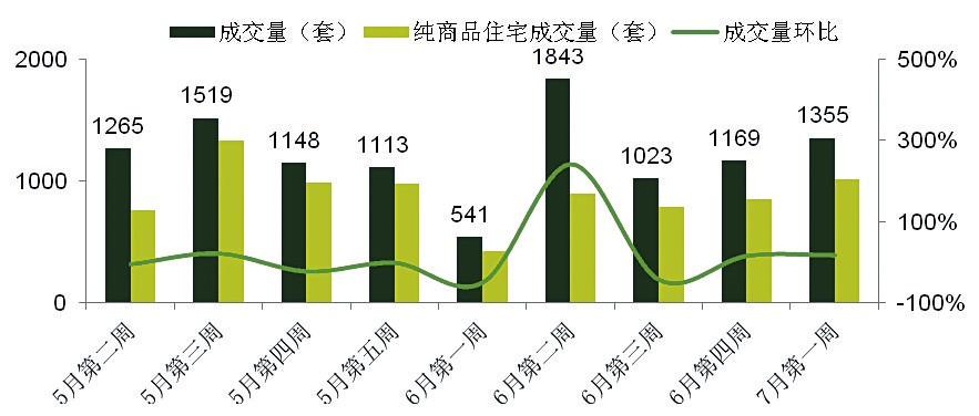 根据链家地产市场研究部统计,7月第一周,新建商品住宅(含保障房)成交1355套,环比上涨15.9%。扣除保障房后,纯商品住宅成交1014套,环比上涨19.7%,比去年同期下降30.5%。