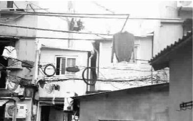 为了进一步了解情况,记者当天下午走访了该地区。复兴东路404弄是一片陈旧的老式小区,北面临街,抚安街则是穿梭其中的一条不到一百米的小路,周边墙面老旧的水泥矮房林立,走入其中,有些地方却比一般人们印象中的老式里弄还要狭窄,仅能容纳一人通过。仔细一看,却发现原来不知从哪里冒出来的水泥平房相互交错着占满了通道,身在其中,不用走出几步,头顶就能被空中违法建筑的阴影罩个正着。