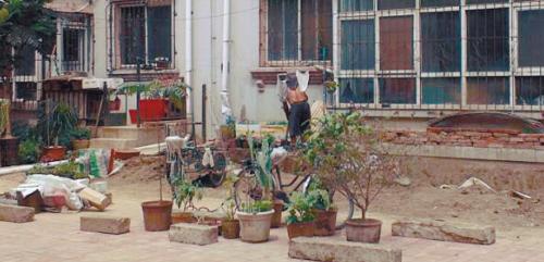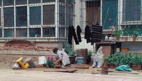 在10号楼不远处的树阴下,两位老人介绍,目前,小区正在进行老旧小区改造,工程从6月份开始的,主要是修路,说是8月10日完工。当记者问到小区一楼前的“自留地”时,两位老人先是欲言又止,后来低声说:“这都是公共用地,可一楼居民种菜、种花的有好几年了。这一片(指一楼窗前的空地)之前都是树,现在都被砍了。”