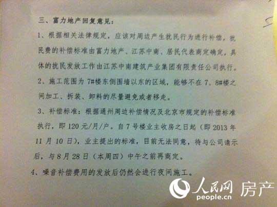在金禧花园业主李先生向记者出示的一份本周一业主代表与北京富力地产方面谈判的会议纪要中,其中“富力地产回复意见”提及,“噪音补偿费用发放后仍然会进行夜间施工”。
