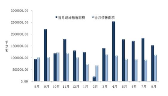 市场供应方面,8月,开发商领取预售许可证速度依旧保持高位,整体供应量约153万方,同比增幅达到62.18%,但环比下降16.60%,较前4个月有所下滑。