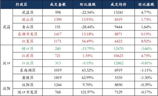 价格方面,市场整体虽然呈现下滑的趋势,但各区域波动幅度不大,且区域性涨幅要大于降幅。具体来看,江夏区本月价格环比上涨8.92%,武昌区也达到4.77%,江岸区达到4.75%,而价格下滑的区域基本都在1%左右。
