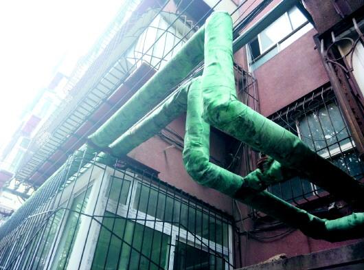 ▲佛山苑内的供暖管道陈旧,保温层基本都脱落了。